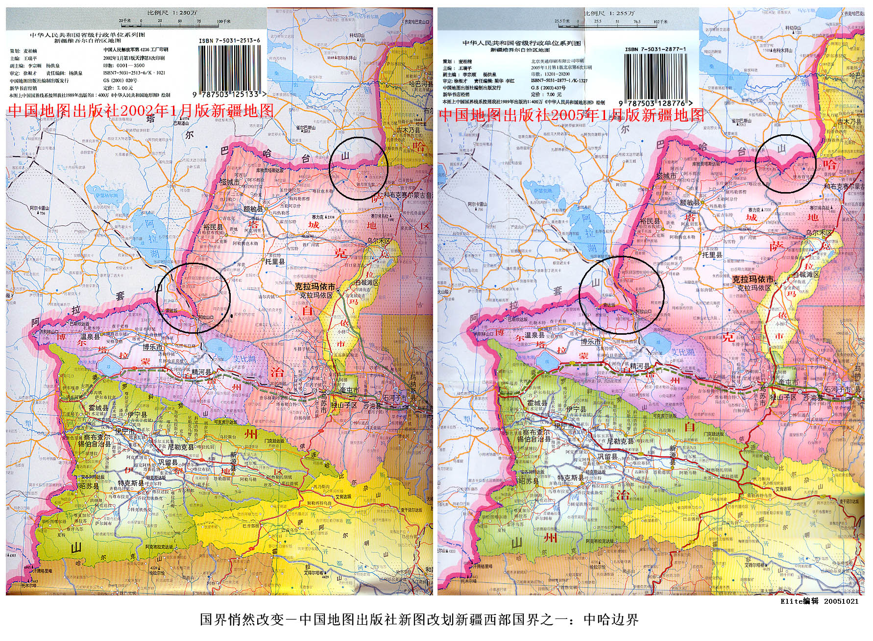 前天买了一幅中国地图出版社2005年1月新版的《新疆地图》,经过和手头保存的2002年1月版新疆地图对比,发现在2005年版地图中,虽然新疆西部国界在帕米尔仍沿用“未定国界”,但是在中哈、中吉、中塔其他地段的国界已经悄悄改画。这可以看作中国与邻国的边界条约的最新标定。